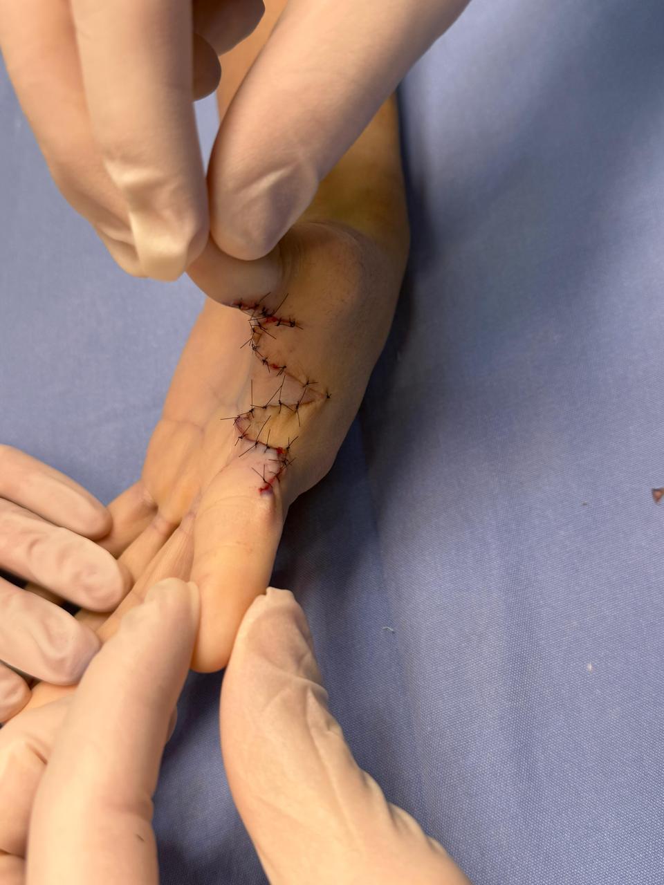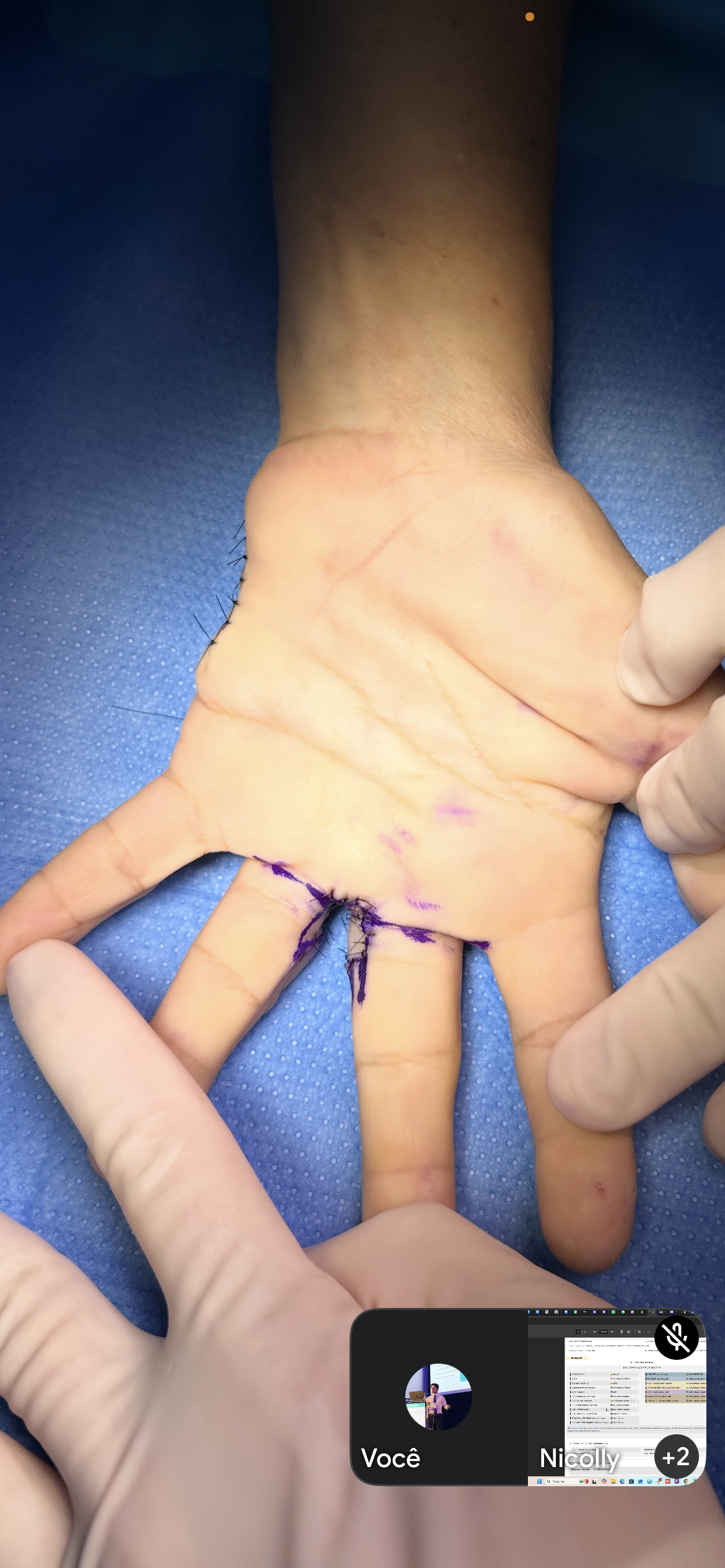 Quando há retração cicatricial importante, pode ser necessário realizar cirurgia de liberação da comissura, com reconstrução da pele para restaurar o espaço entre os dedos e melhorar a mobilidade.