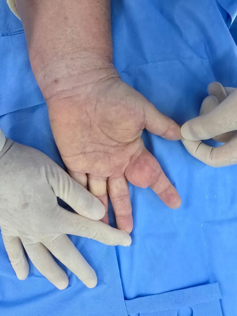 O objetivo é eliminar o nódulo com segurança e preservar todas as estruturas da mão.